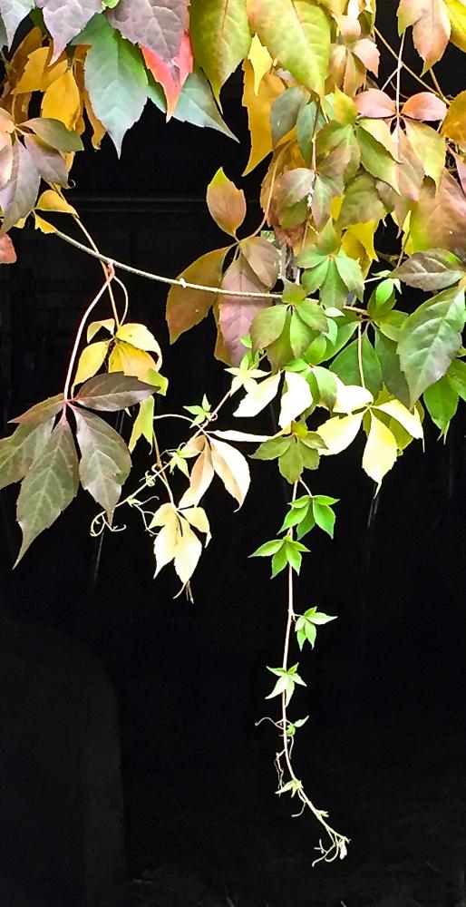 Wie ein Gemälde ranken sich die Blätter vor dem Eingang eines Stalles.