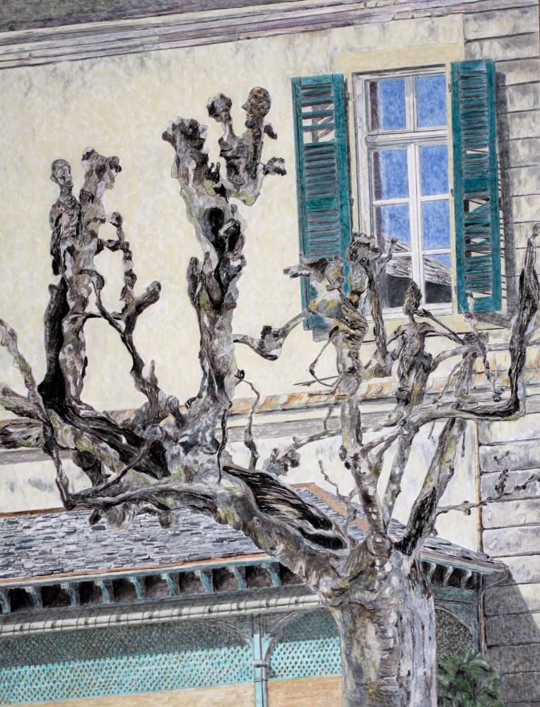Das Château de Vullierens liegt bei Morges und ist wegen seines europaweit grössten Iris-Gartens bekannt. Die Wettbewerbsarbeiten mussten ein Motiv aus den Gärten des Schlosses enthalten. Ich entschied mich für eine fast komplett ausgehöhlte Platane, deren Äste mich an Giacometti-Figuren erinnerten. So betitelte ich mein Werk, das ich mit Farbstiften ausgeführt habe, mit „Les ‚Giacometti’ du Château“.