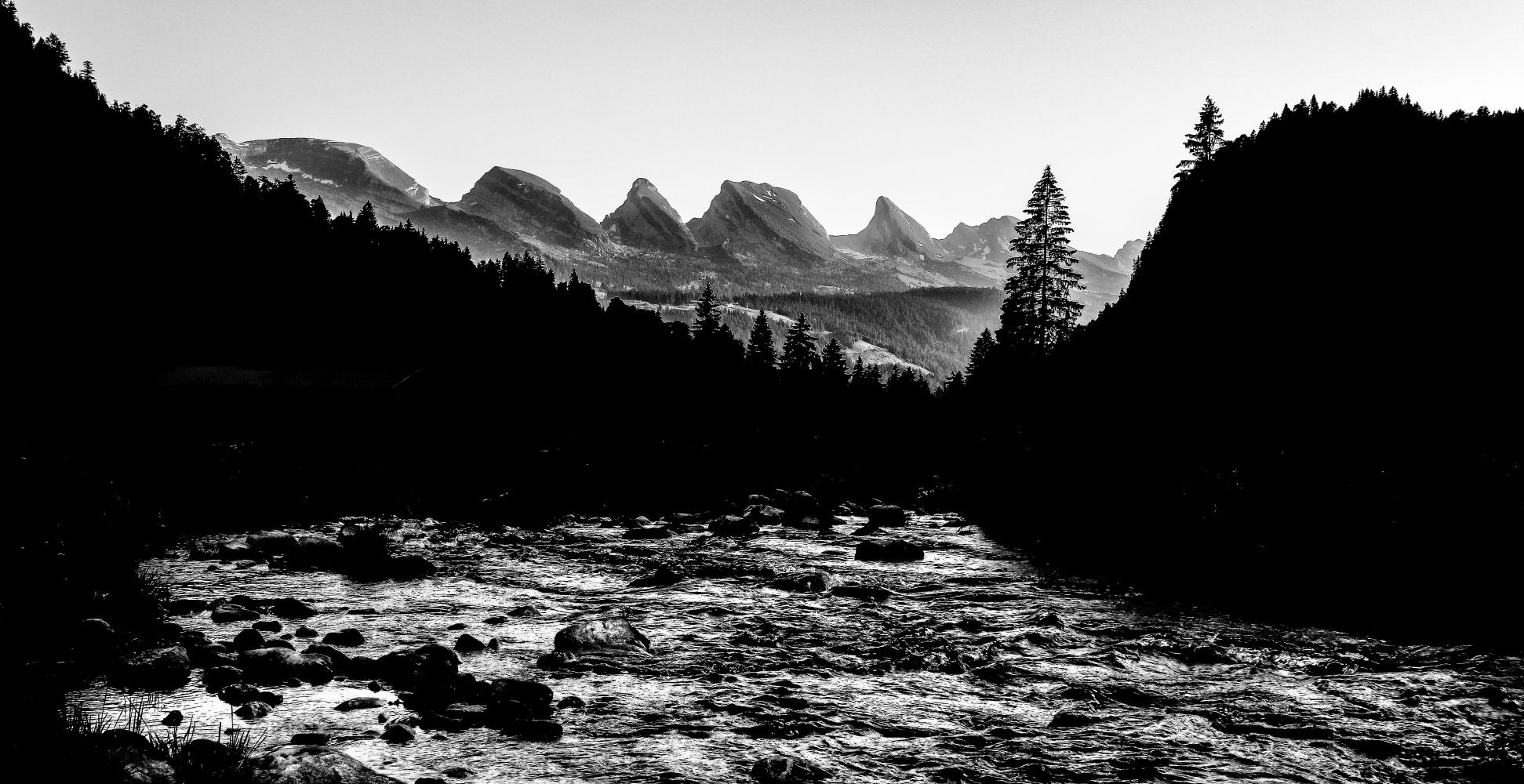 Die sieben Churfirsten – das Wahrzeichen des Toggenburgs, hier in schwarzweiss in Szene gesetzt.