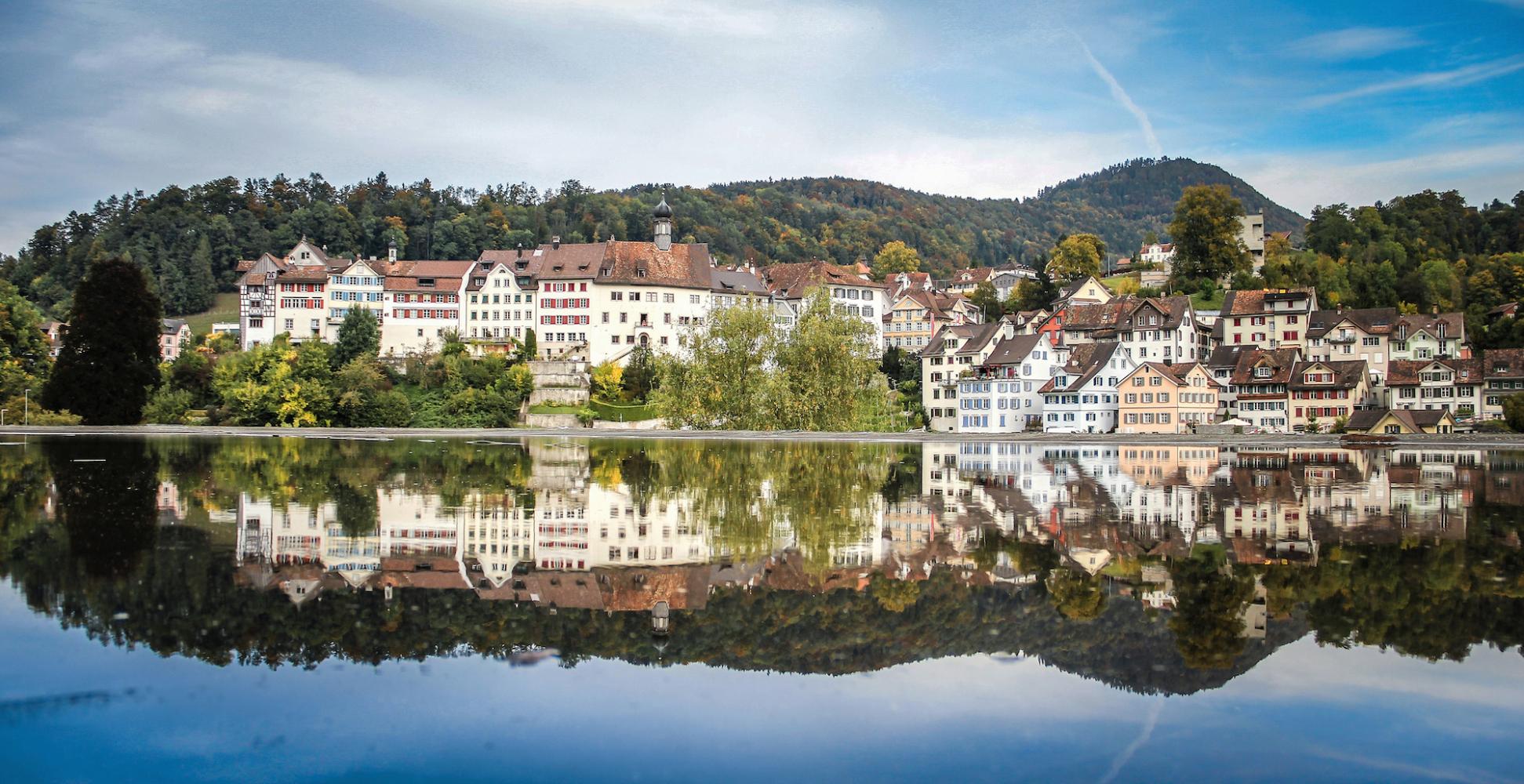 Das Toggenburger Städtchen Lichtensteig in einer aussergewöhnlichen Darstellung – im Spiegelbild einer Flachdach-Wasserlache...