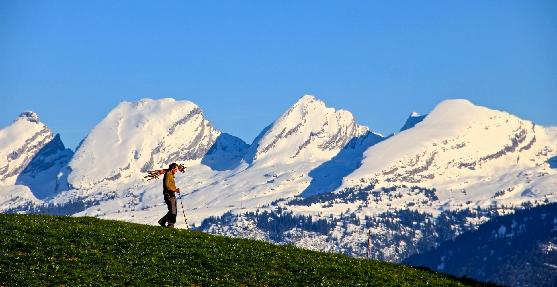 Ein Jungbauer beim "Hage" vor der Kulisse der Churfirsten.
