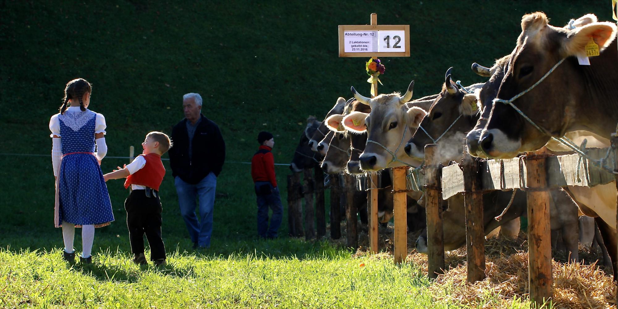 Das Trachtenmädchen und der lachende Junge - aufgenommen während einer Viehschau im toggenburgischen Ebnat-Kappel.